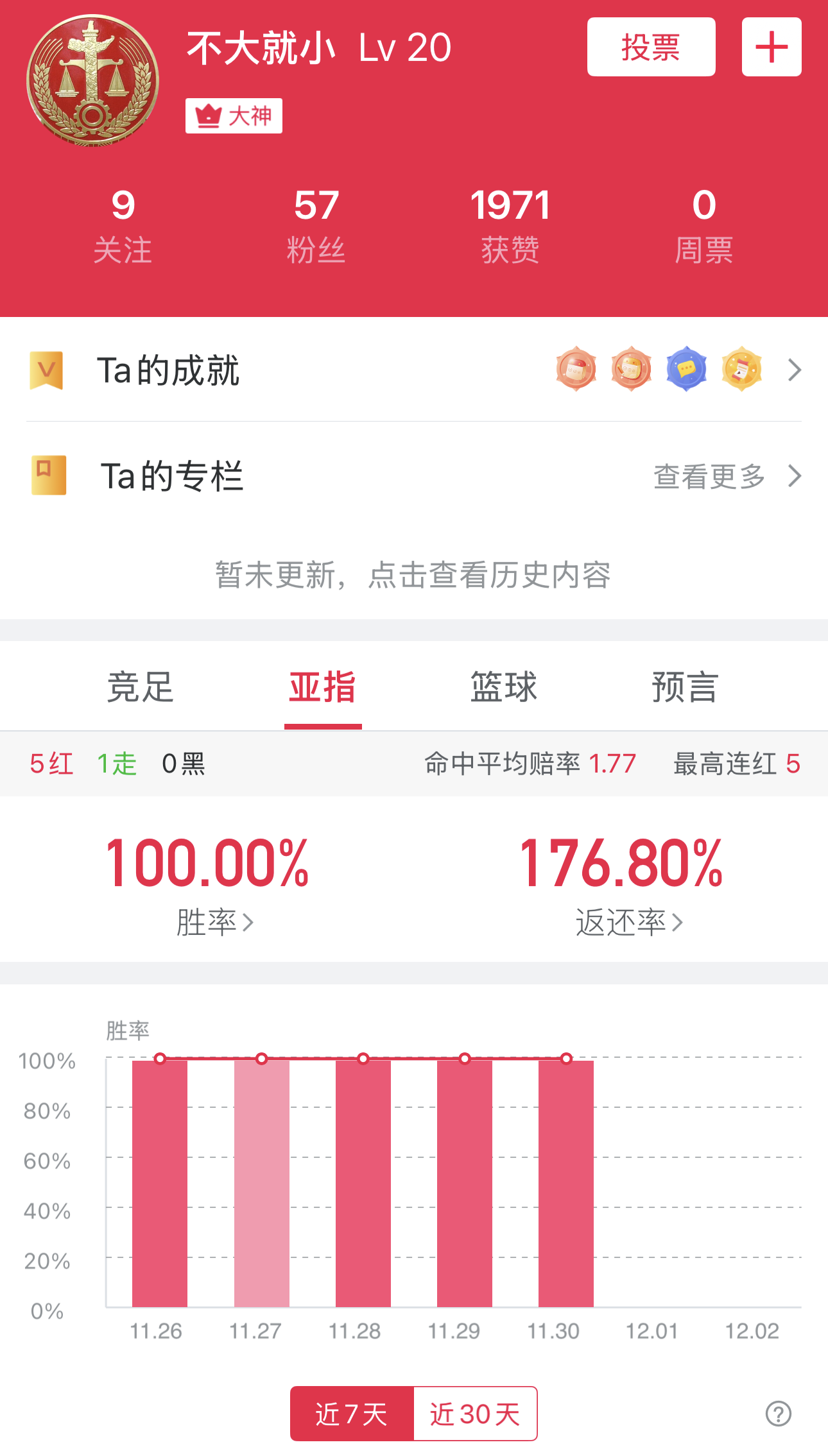 今日用户不大就小 进行了公推,目前他的状态也是十分不错,亚指5连红的战绩,近7日胜率为100%,让我们期待他将火热状态延续下去。