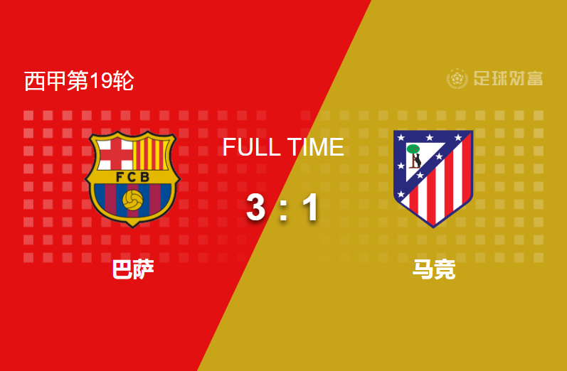 最终全场比赛结束,巴萨主场3-1击败马竞。