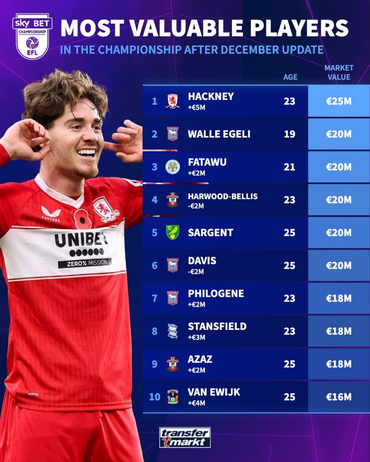 其中希顿·赫根尼身价为2500万欧元,排名英冠第一。瓦勒·埃格利、伊萨哈库、贝利斯、约什·萨尔根特、雷伊夫·戴维斯等人都达到了2000万欧元。