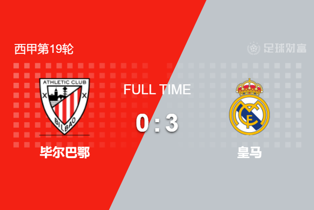 最终全场比赛结束,皇马客场3-0大胜毕尔巴鄂竞技。