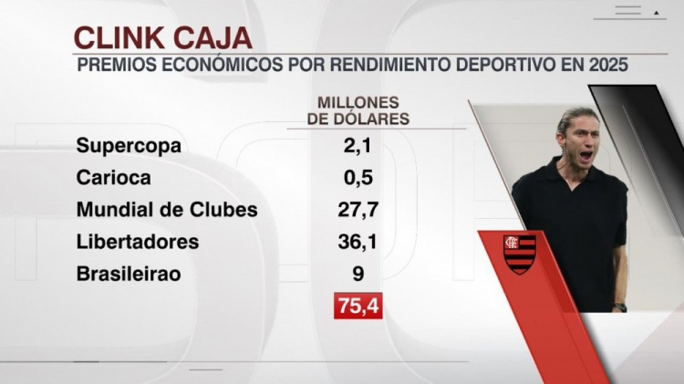 赛后相关数据统计,弗拉门戈在2025年收获颇丰,参加5项赛事夺得4座冠军,各项赛事表现让他们共计拿到7540万美元的奖金,其中解放者杯夺冠获得3610万美元奖金,而世俱杯拿到了2770万美元奖金。