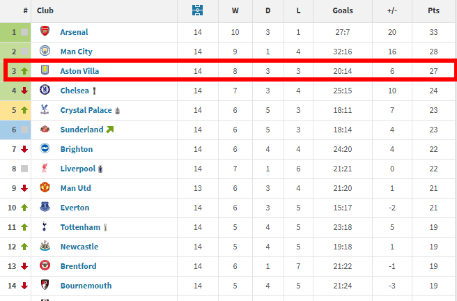 维拉下一轮英超对手是来自榜首的阿森纳,如果能够主场击败枪手,球队则有希望升至联赛第二。