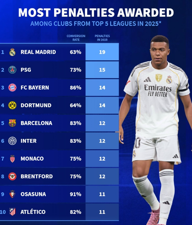 近日,德转盘点了2025年至今,五大联赛球队各项赛事获得点球数量排行榜,皇马以19粒点球高居第一,但得分转化率只有63%。大巴黎获得15粒点球排名第二,拜仁和多特获得14粒点球并列第三,得分转化率最高的球队是奥萨苏纳,达到91%。