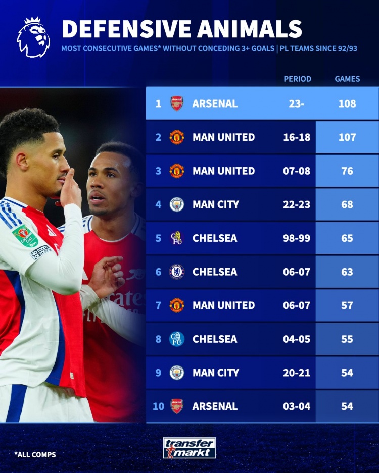 根据德转统计,阿森纳已经各项赛事连续108场失球不超过3粒,超越曼联连续107场失球不超过2粒的记录,成为英超球队该项记录的新领头者。