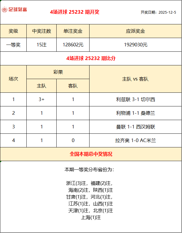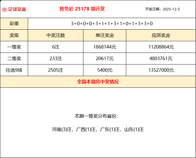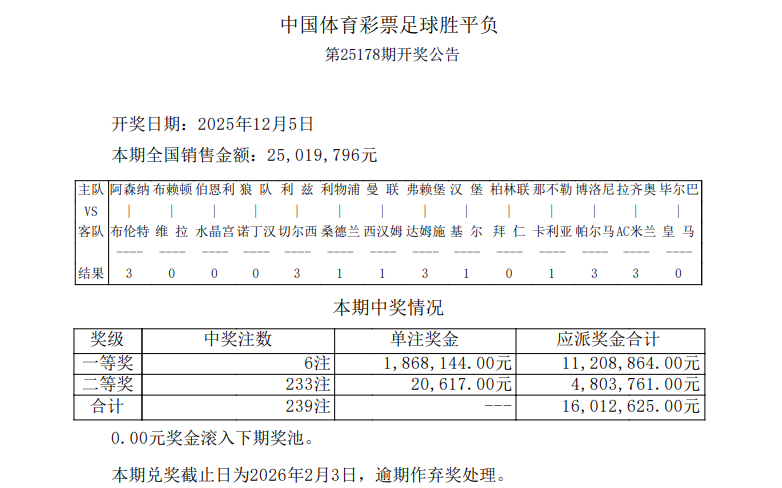 胜负彩25178期开奖:切尔西爆冷负!头奖6注186万