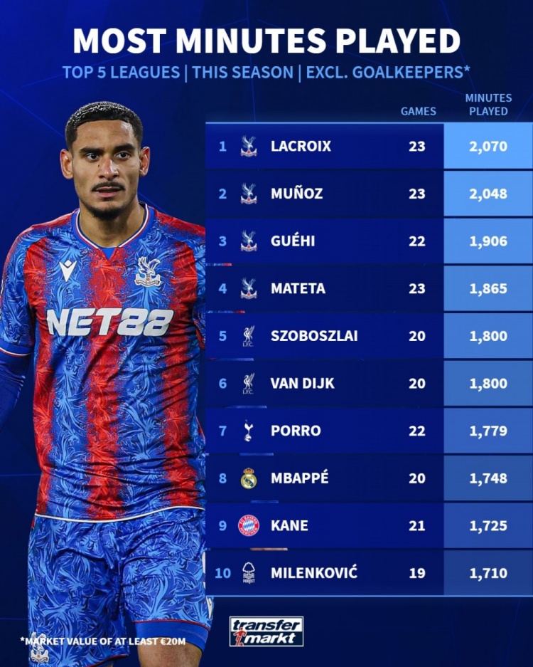 本赛季五大联赛非门将出场时间榜:水晶宫四人领衔,红军两将在列