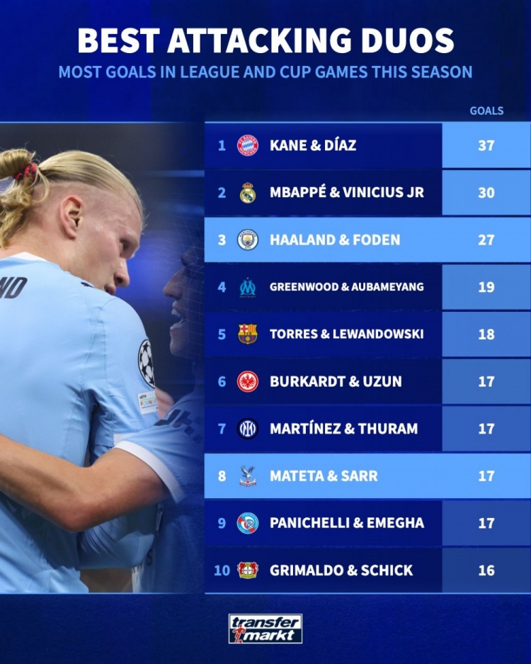 近日,德国转会市场列出了本赛季进攻端最佳双人组合,拜仁前锋凯恩和迪亚斯共打入37球最多,其次是姆巴佩与维尼修斯打入30球。