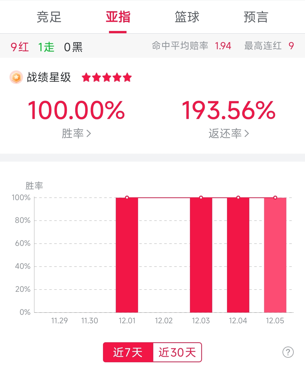 恭喜用户“黎哥 ”亚指9连红,5天命中9场,返还率高达193.56%,在近30天的胜率也高达75.86%。“黎哥 ”今天公推了西甲:奥维耶多vs马洛卡,两场荷乙坎布尔vs登博斯,瓦尔韦克vs芬洛,感兴趣可以去他的帖子看看,他给出了自己对比赛的看法。