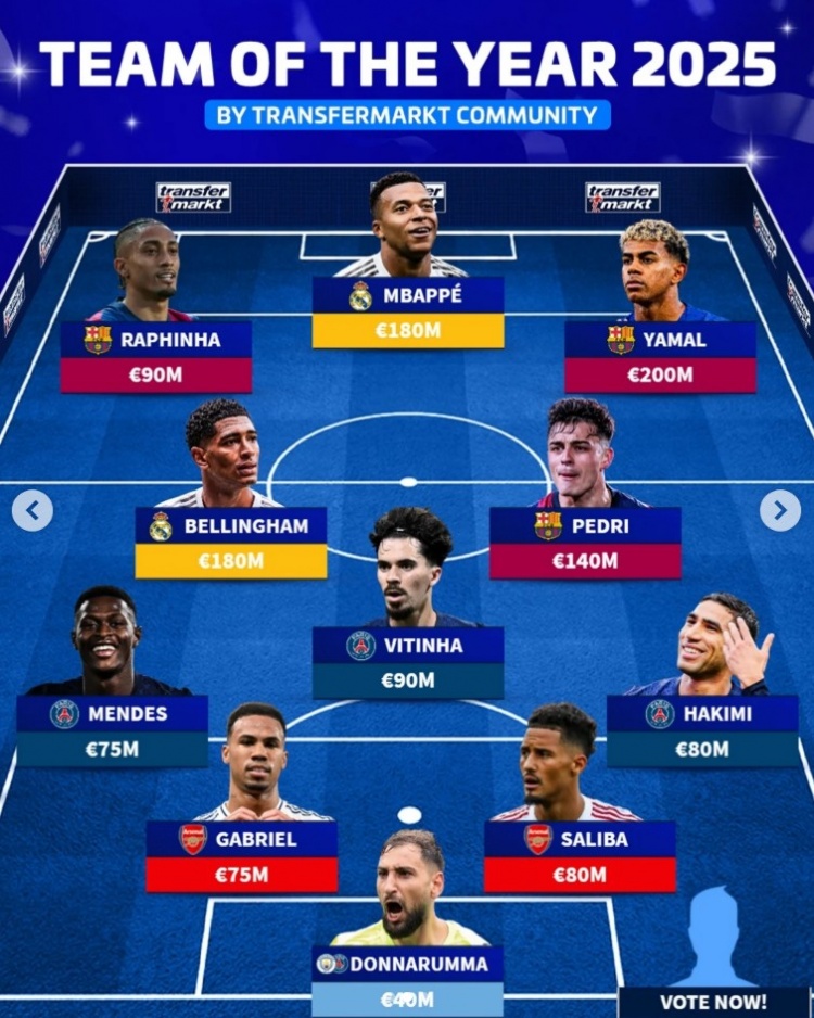 德国转会市场网站统计了2025年年度最佳阵容投票,目前年度最佳11人阵容已经出炉。