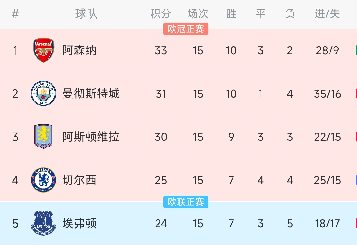 在最新的英超积分榜中,由于曼城、维拉在本轮赢球,阿森纳的榜首优势仅剩2分。
