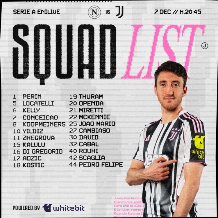 北京时间12月8日凌晨3点45分,尤文将在意甲联赛第14轮奔赴客场挑战那不勒斯,赛前尤文公布了本场比赛大名单。