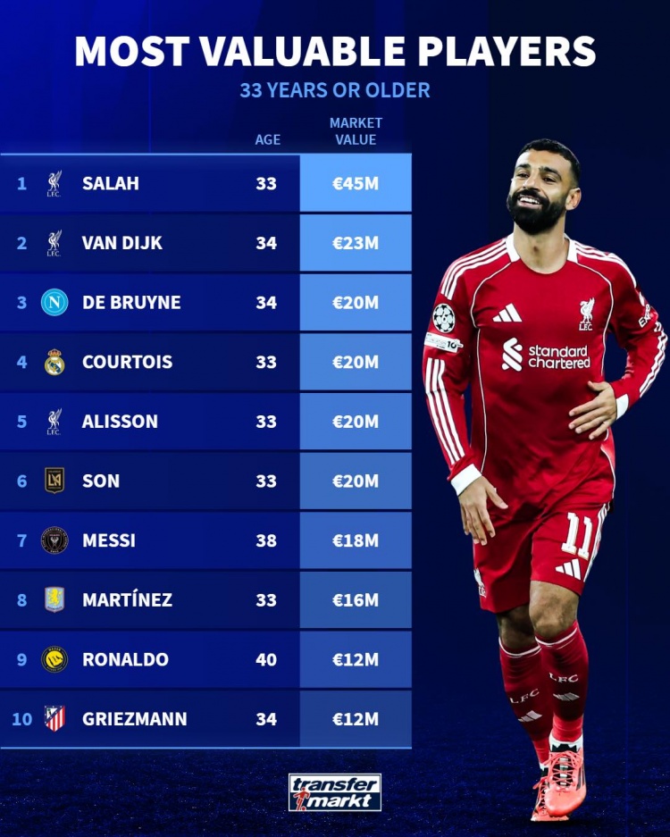北京时间12月7日,德国转会市场统计出了33岁以上年龄球员身价排名,其中利物浦前锋萨拉赫以4500万欧元排在首位,梅西第7、C罗第9。