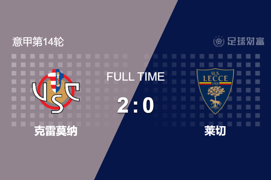 最终全场比赛结束,克雷莫内塞2-0击败莱切。