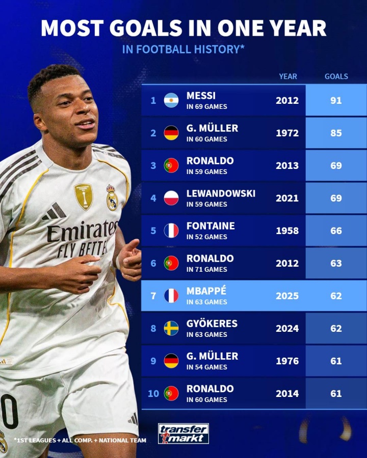 近日,德转盘点了足坛历史自然年进球纪录,梅西2012年打进91球排名历史第一,C罗2013年打进59球排名历史第三位,姆巴佩2025年已经打进62球,排名历史第7位,他还有3场比赛机会,继续冲击榜单前五位。