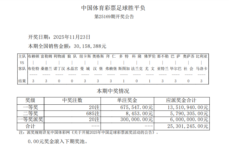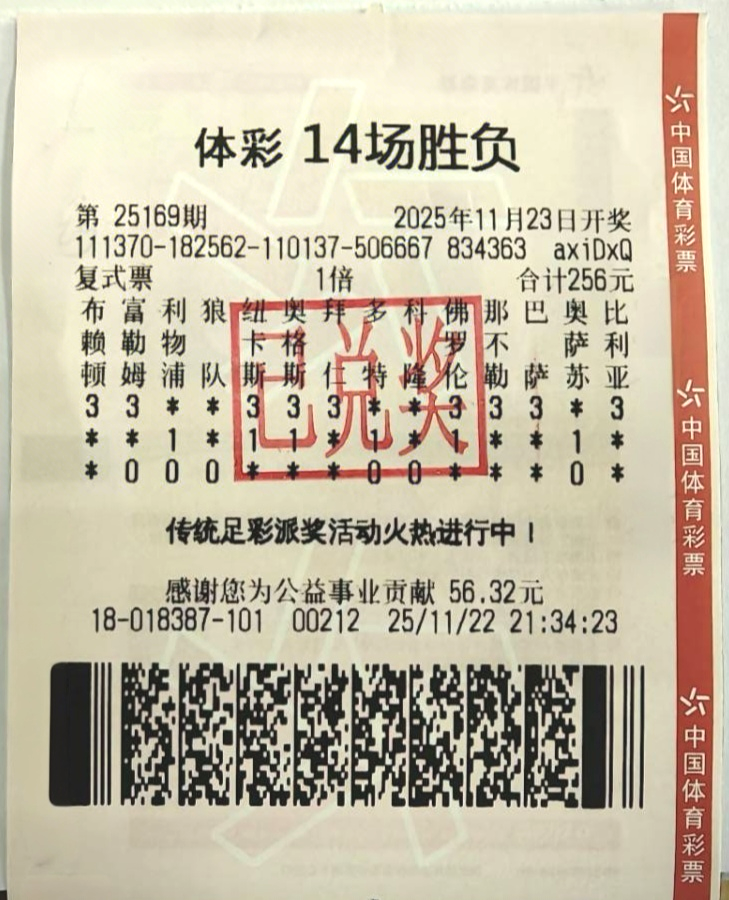 在上个月末,胜负彩25169期开奖,来自山东日照的彩民用一张256元复试,最终斩获1注一等奖、2注二等奖,外加300000元派奖奖金,最终奖金总额突破百万,达到了税前1034718元,咱们来看一看他的选择方式。