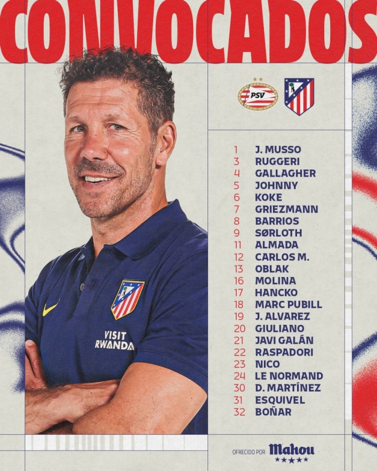 北京时间12月10日凌晨4点,马竞将在欧冠联赛阶段第6轮客场挑战埃因霍温,赛前马竞公布本场比赛大名单。