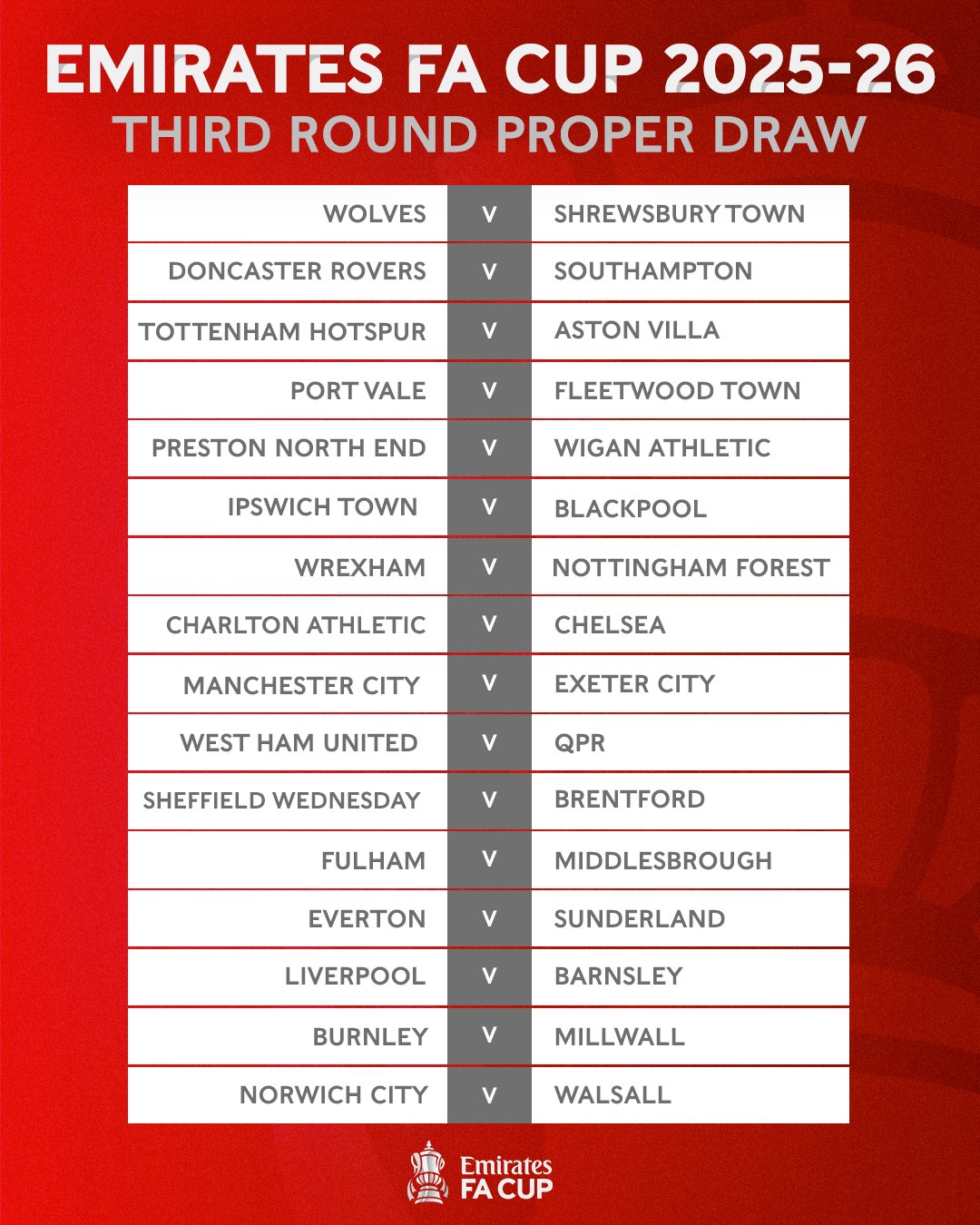 北京时间12月9日,英格兰足总杯公布了第三轮对阵情况,热刺将在主场迎战阿斯顿维拉,桑德兰主场对阵埃弗顿,纽卡vs伯恩茅斯、曼联vs布莱顿,切尔西、曼城、利物浦、阿森纳将面对低级别球队。
