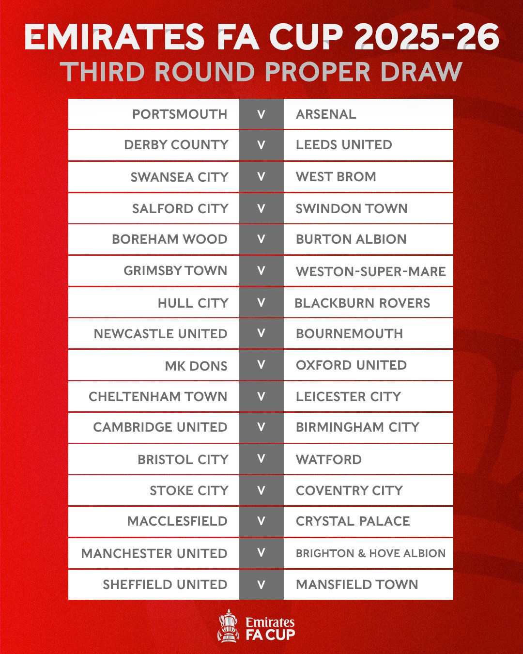 足总杯第三轮抽签:枪手红军碰弱旅,曼联vs布莱顿
