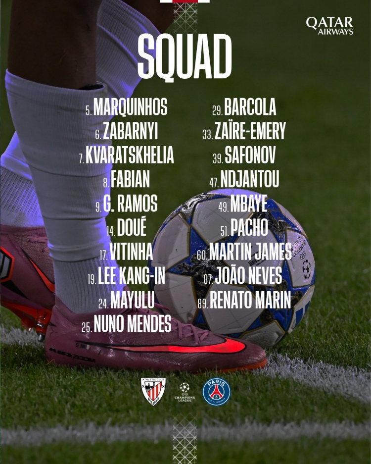 名单中,登贝莱因为伤病问题未能入选,舍瓦利耶、阿什拉夫、贝拉尔多、卢卡斯缺席,杜埃、努诺-门德斯伤愈回归。
