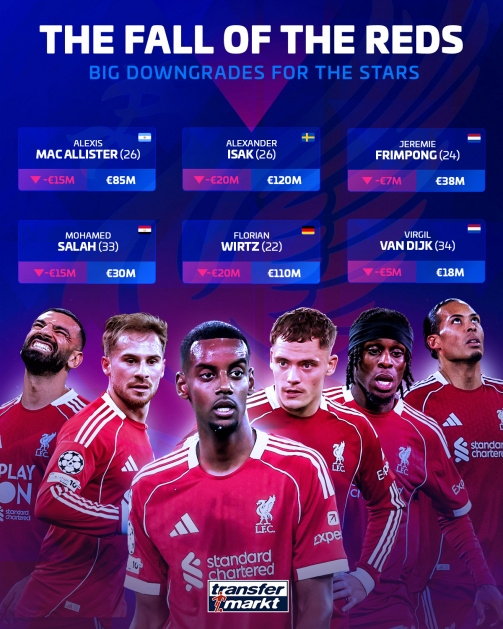 📉暴跌!利物浦多人身价下滑,伊萨克、维尔茨降2000万