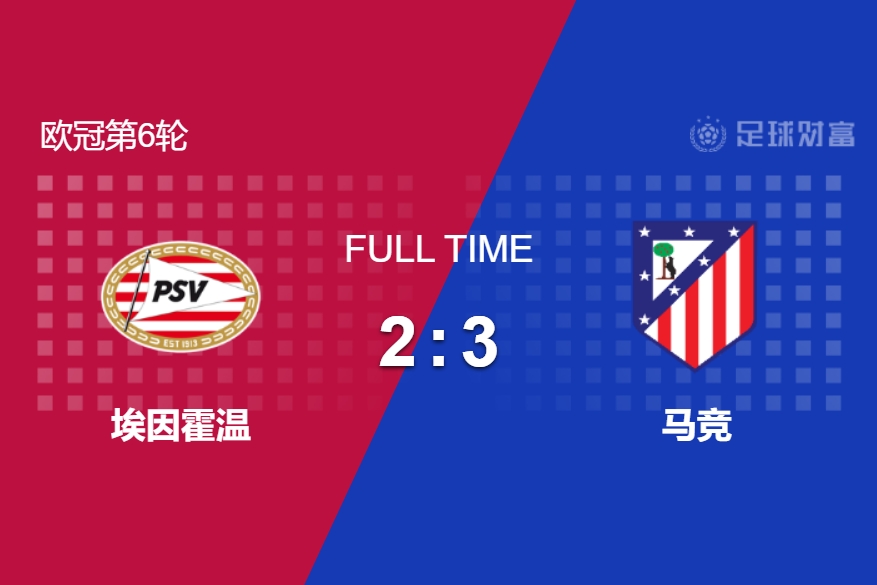 最终全场比赛结束,埃因霍温主场2-3不敌马德里竞技。