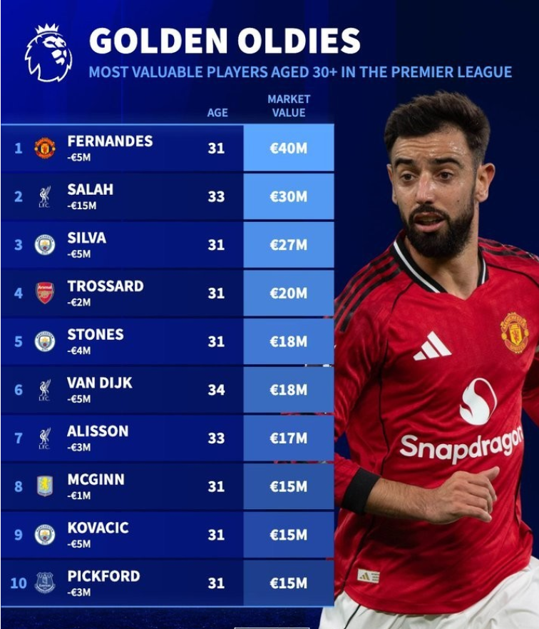 北京时间12月10日,德转更新了英超球员身价,并列出英超30岁以上球员身价榜,标注身价变化情况。由于年龄原因,所有上榜球员身价均有所下跌,其中B费下跌500万欧元,以4000万欧元排名第一位,萨拉赫3000万欧元排名第二,身价下跌多达1500万欧元。