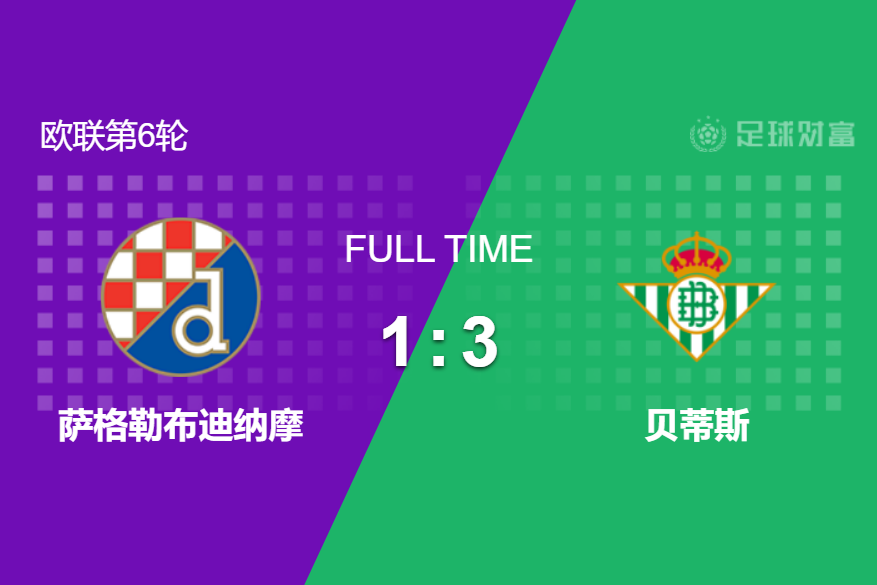 最终全场比赛结束,萨格勒布迪纳摩1-3不敌皇家贝蒂斯。