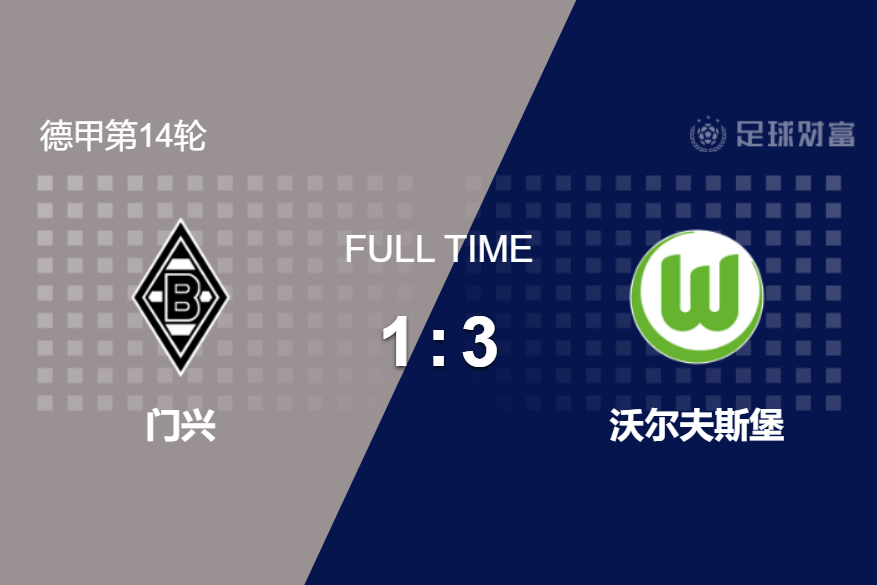 最终全场比赛结束,门兴格拉德巴赫主场1-3不敌沃尔夫斯堡。