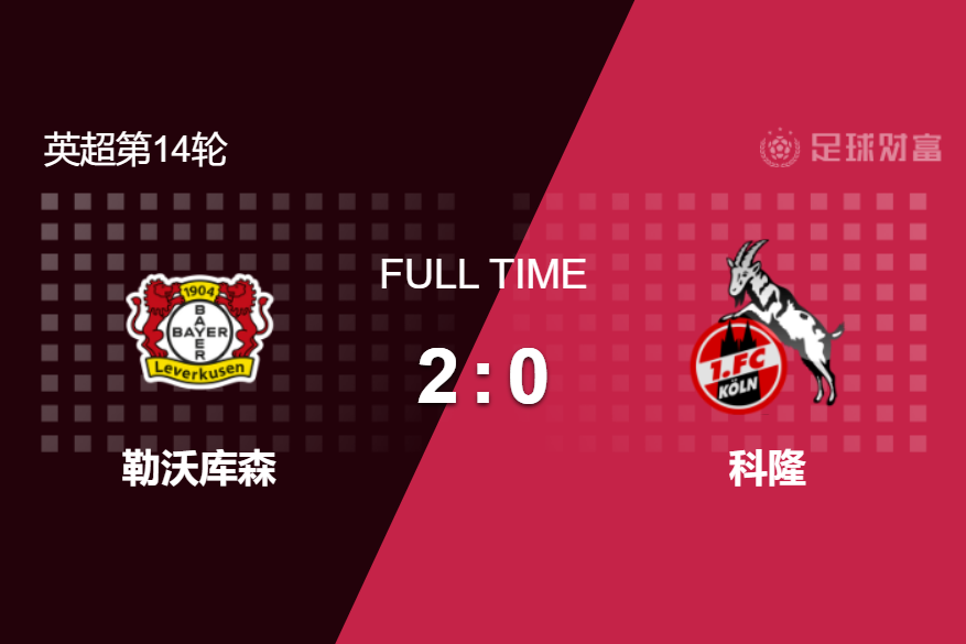 最终全场比赛结束,勒沃库森主场2-0击败科隆。