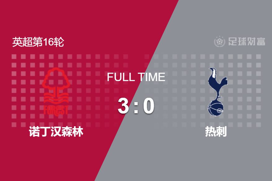 最终全场比赛结束,诺丁汉森林主场3-0完胜热刺。