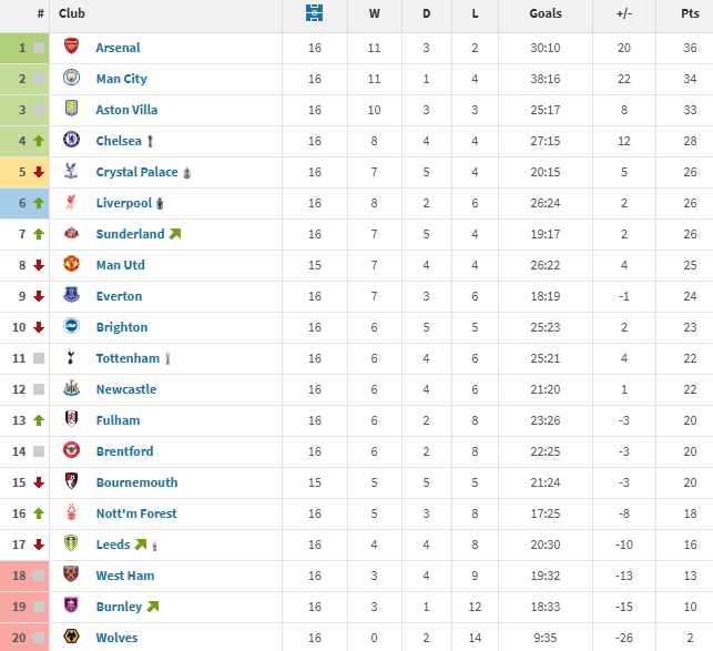 身后的曼城近期英超联赛豪取4连胜,阿斯顿维拉近11轮英超联赛10胜,仅输客场输给了利物浦,目前曼城与阿森纳相差2分,维拉与阿森纳相差3分,两队不断向阿森纳施压。