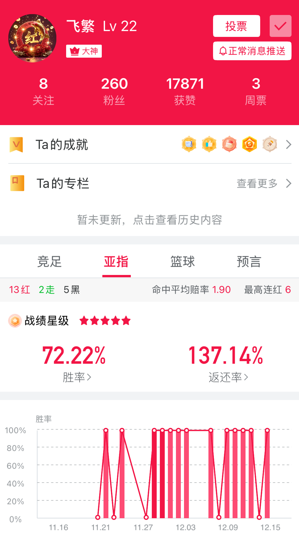 用户飞繁 今日继续免费公推,亚指近13中11胜率不俗,返还率达到137.14%!