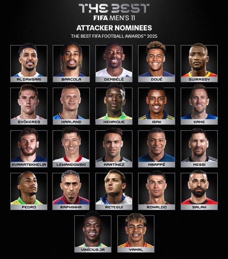 达瓦萨里、巴尔科拉、登贝莱、杜埃、吉拉西、哲凯赖什、哈兰德、路易斯-恩里克、伊萨克、哈里-凯恩、克瓦拉茨赫利亚、莱万多夫斯基、劳塔罗、姆巴佩、若昂-佩德罗、拉菲尼亚、雷特吉、C罗、萨拉赫、维尼修斯、亚马尔