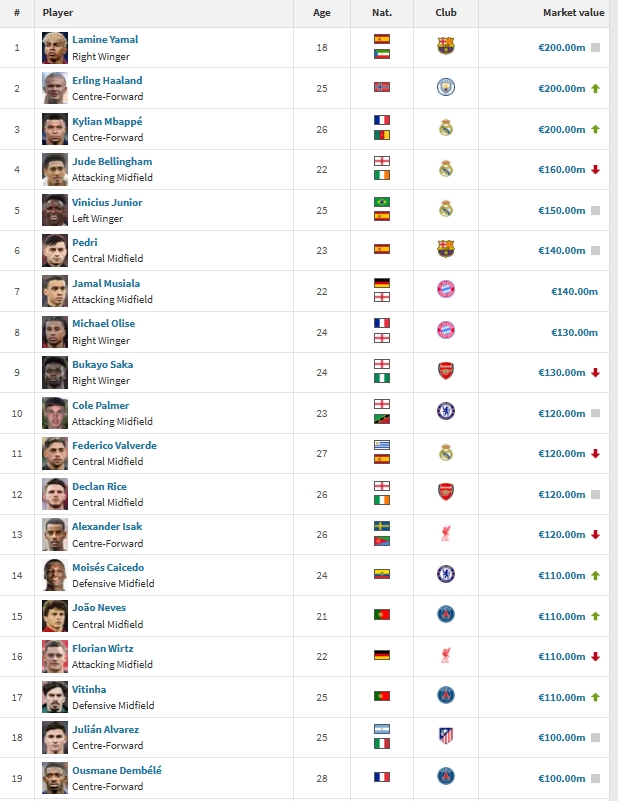 近日,德国转会市场更新了五大联赛球员最新身价,一共有19名球员身价过亿,其中姆巴佩、哈兰德、亚马尔身价达到2亿最高,其次是贝林厄姆1.16亿欧元。