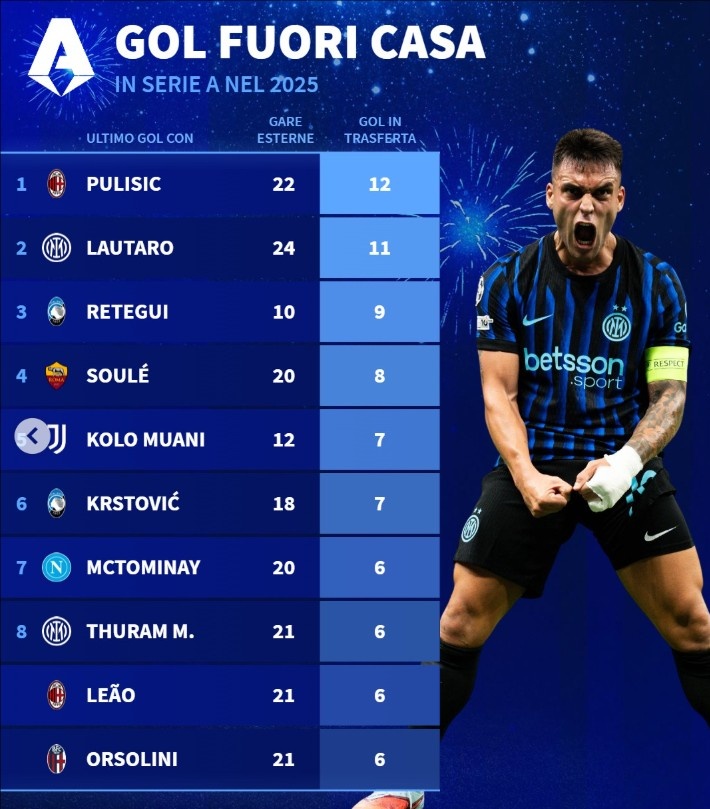 意甲球员2025年客场进球排行:普利希奇居首,劳塔罗在列