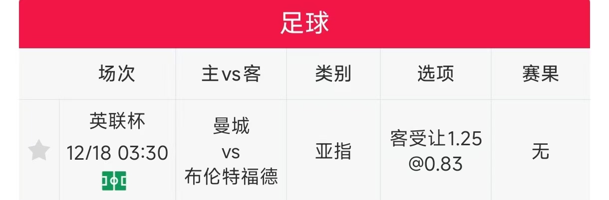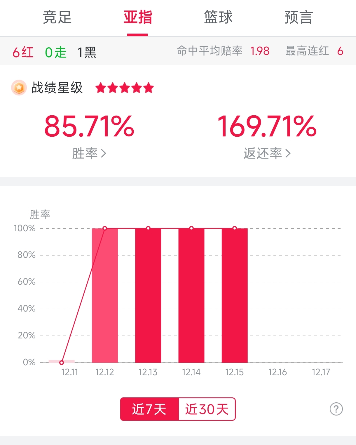 恭喜用户奔泽马 近期6连红,7天7中6,胜率85.71%,返还率169.71%,亚指战绩榜第7名。奔泽马 在今天公推了英联杯:曼城vs布伦特福德,洲际杯决赛:巴黎vs弗拉门戈,感兴趣可以作为参考,点击名字也可以看到他的分析。