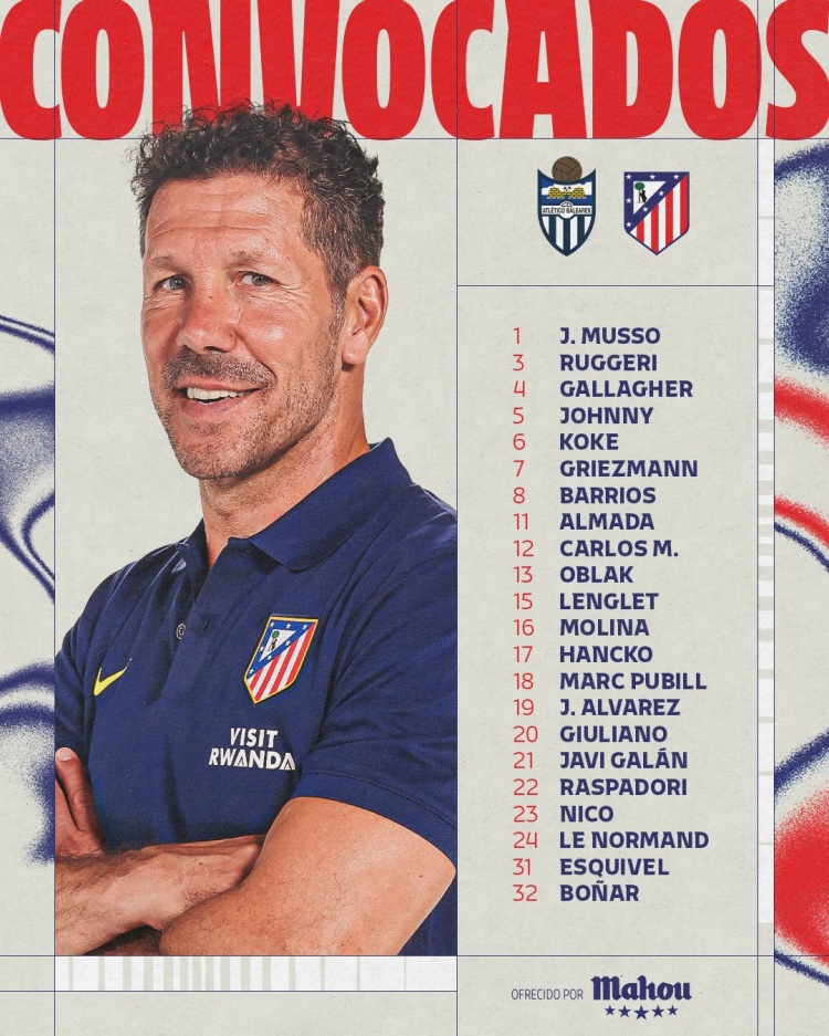 名单中,朗格莱伤愈复出,瑟尔洛特、吉梅内斯、巴埃纳、略伦特缺席比赛,格列兹曼、阿尔瓦雷斯、汉茨科、奥布拉克等人入选。