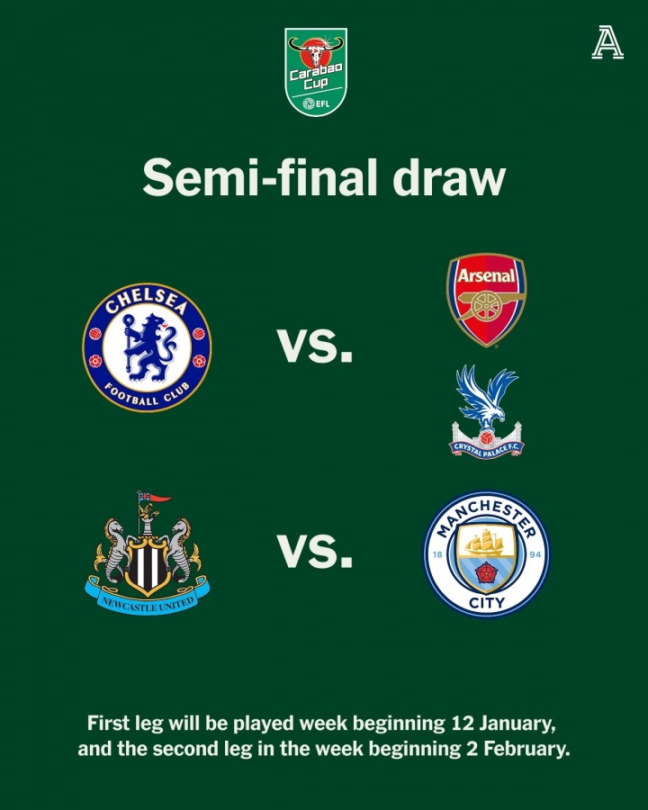 英格兰联赛杯半决赛对阵抽签结果出炉,另一场半决赛中,切尔西将等待阿森纳与水晶宫之间的胜者。