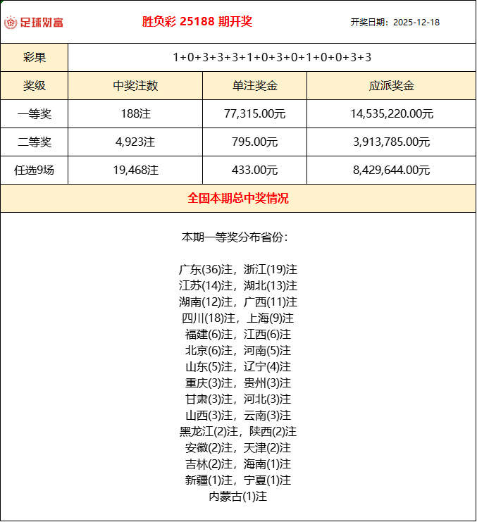 胜负彩25188期开奖:纽卡2-1绝杀!头奖188注7.7万