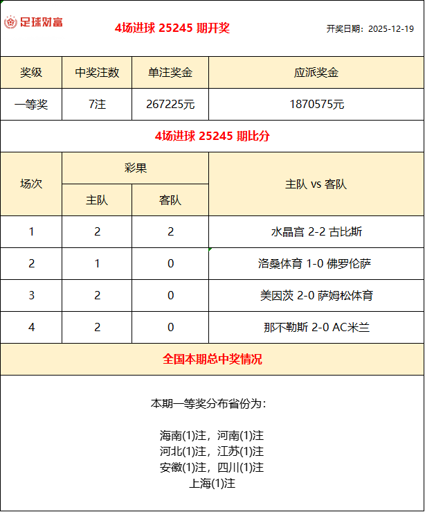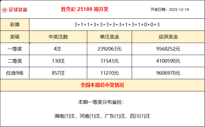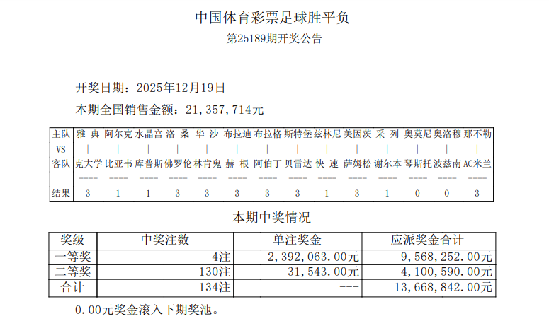 胜负彩25189期开奖:佛罗伦萨爆冷负!头奖4注239万