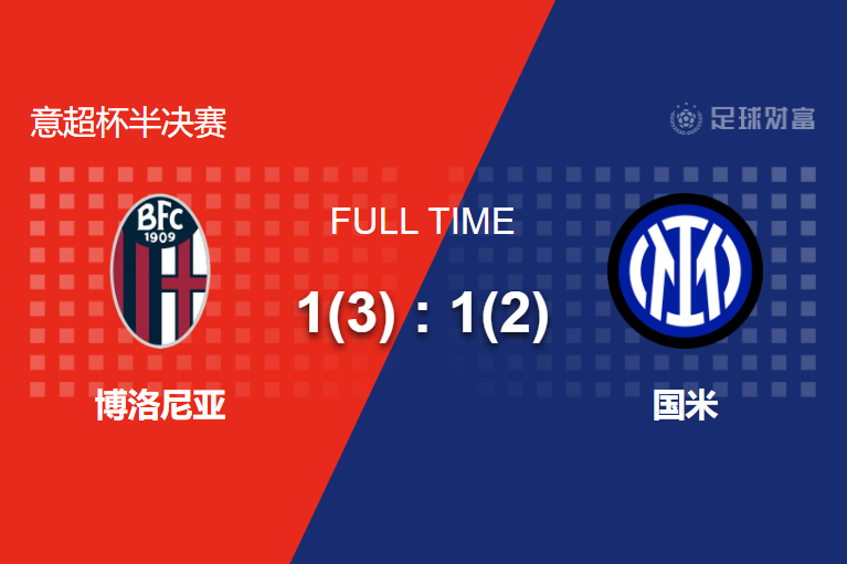 常规时间两队1-1战平,进入点球大战,国米这边巴斯托尼、巴雷拉、博尼先后罚丢,因莫比莱罚入致胜点球,博洛尼亚点球3-2淘汰国米晋级决赛!
