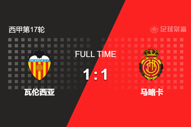 最终全场比赛结束,瓦伦西亚主场1-1战平马略卡。