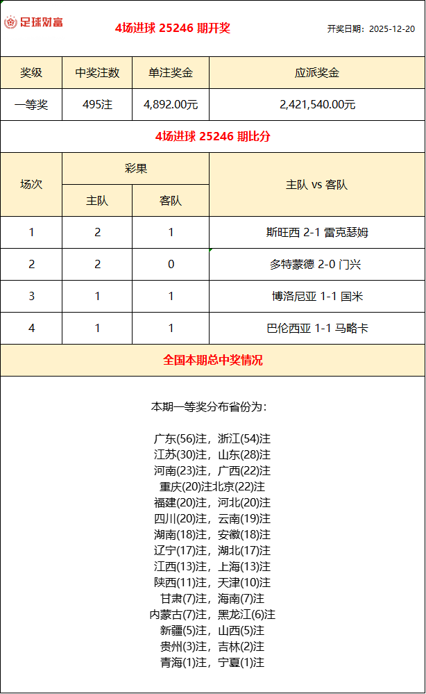 4场进球25246期开奖:斯旺西2-1绝杀!头奖495注