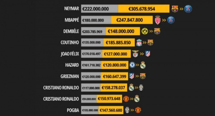 考虑通胀足坛历史转会费榜:内马尔3亿居首!姆总C罗上榜