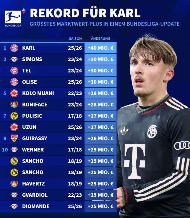 1. 伦纳特-卡尔(拜仁慕尼黑) 25-26赛季 +4000万欧元