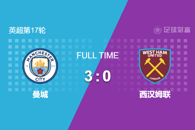 最终全场比赛结束,曼城主场3-0大胜西汉姆联。
