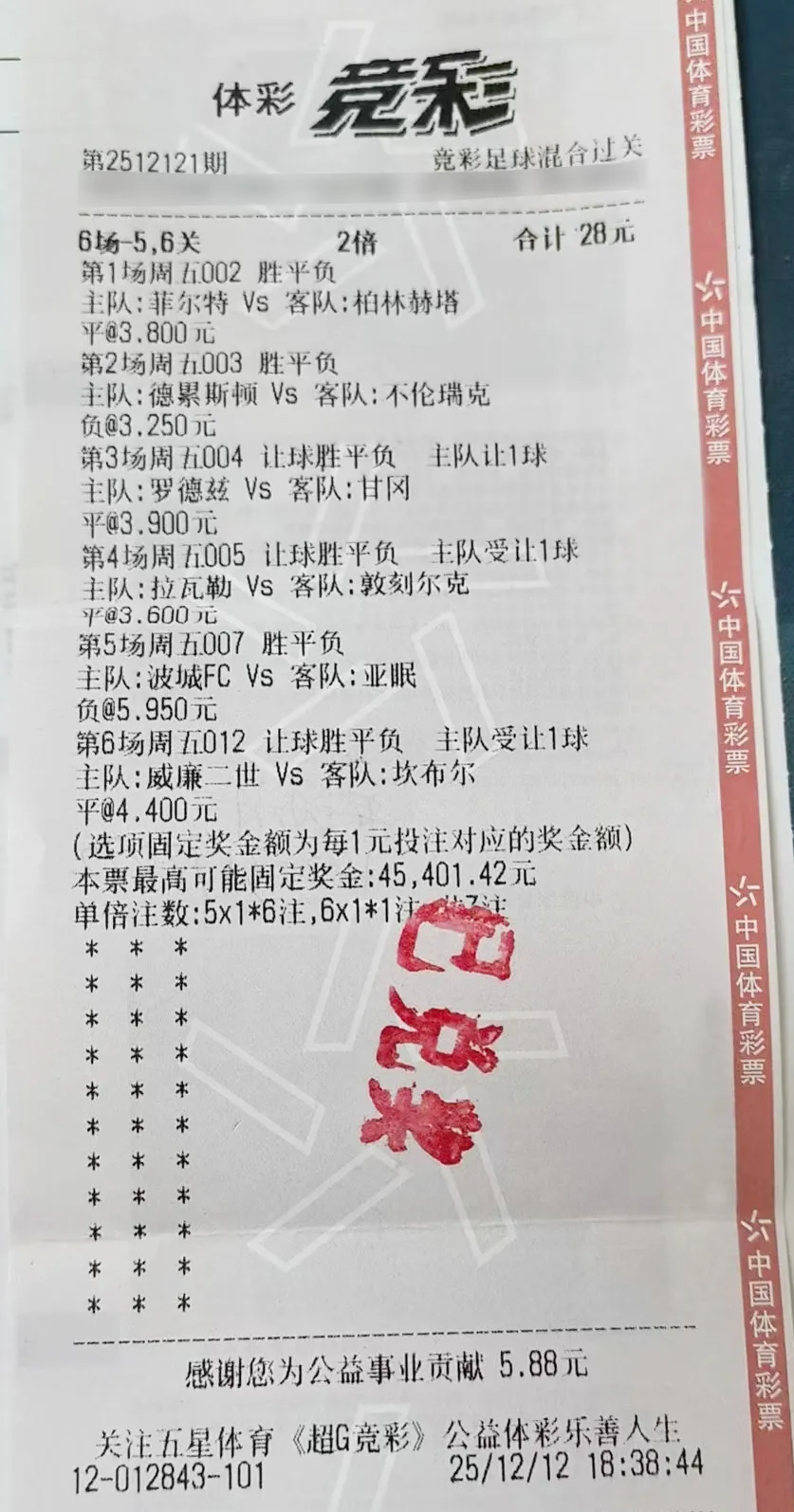 在上周五,来自浦东新区彩民购买了竞足混合过关,6场过5-6关,打了2倍,最终这名彩民以28元命中税前4.5万奖金。