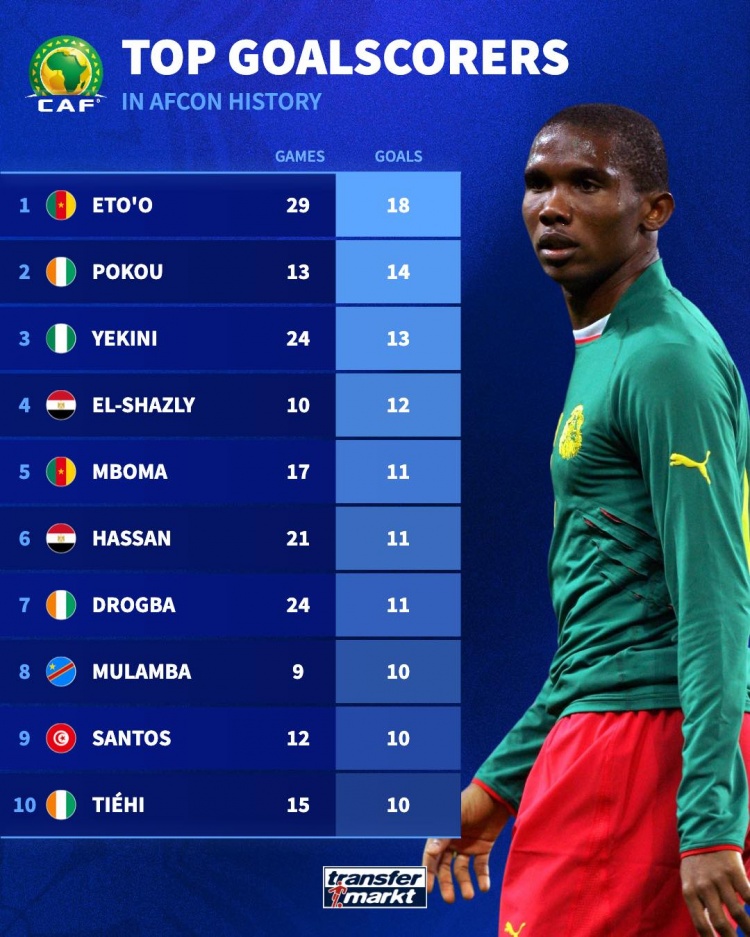 非洲杯比赛已经开幕,德国转会市场网站列出了非洲杯历史射手榜,其中喀麦隆射手埃托奥以18球排名第一。