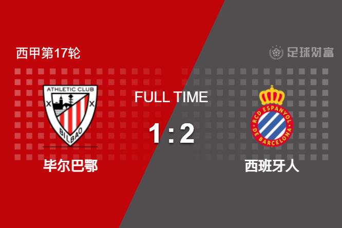 最终全场比赛结束,西班牙人客场2-1逆转毕尔巴鄂竞技。
