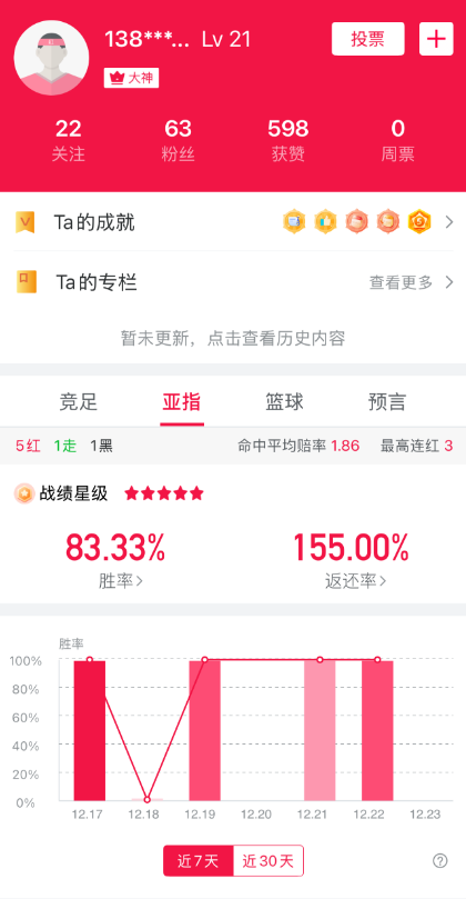 用户138****2323 近期的状态十分不错,亚指近10中9,今日他公推了一场英联杯的比赛,感兴趣的小伙伴点击用户头像,最新发帖即可查看。